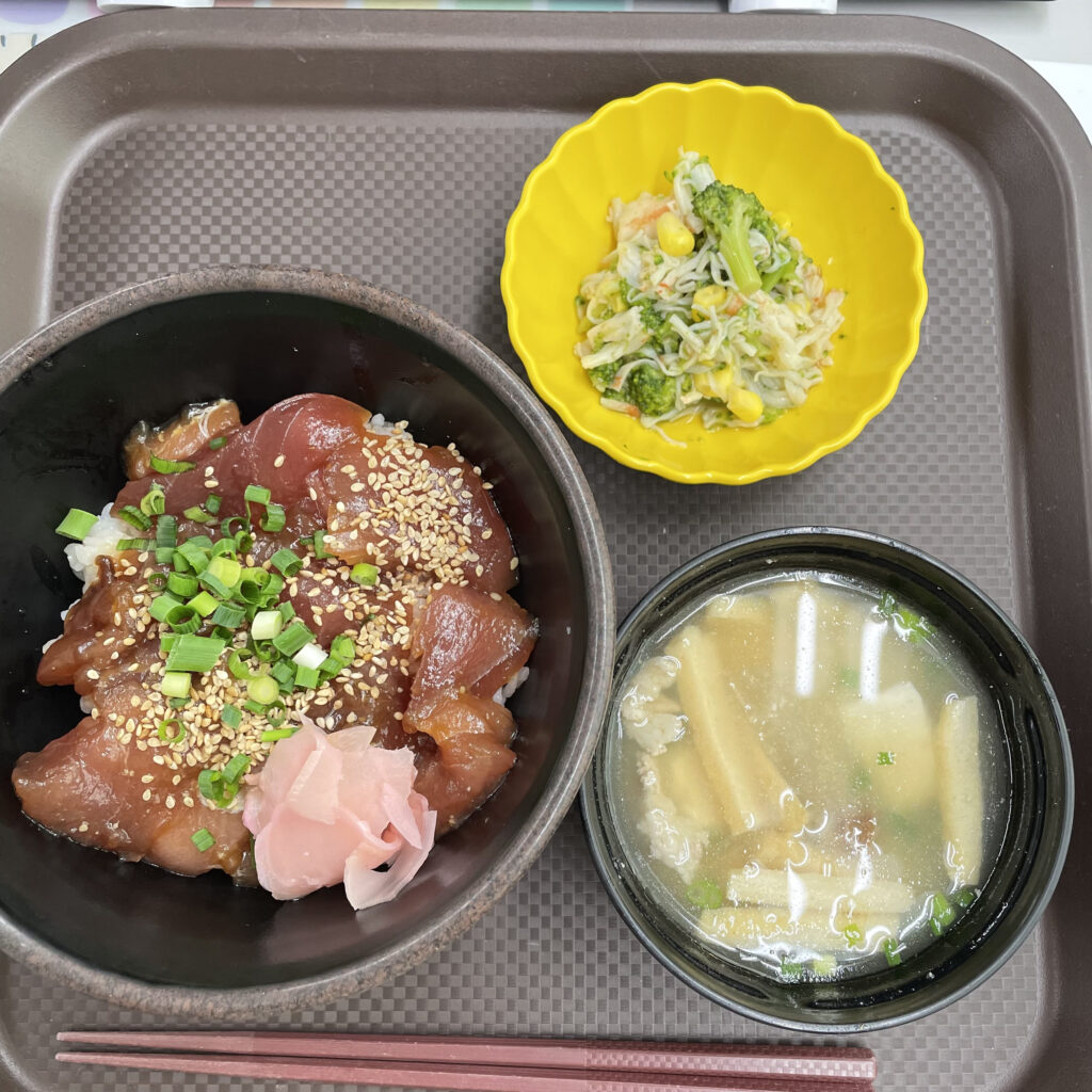 昼食はそのまま多目的ホールにてまぐろ丼を提供し、みなさん「美味しいね」